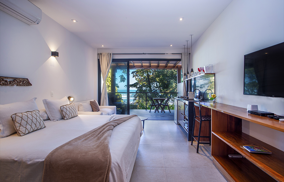 Flat contemporâneo a beira mar com sala integrada no piso superior.